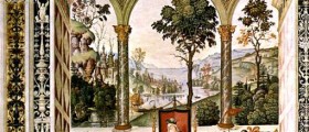 Behind the illustrious opens a grand loggia decorated old-fashioned, overlooking a stunning landscape. As is typical of Pinturicchio, the landscape is enlivened by some bizarre elements, such as the rocky spur on the left and the towered city along the river crossed by boats, characteristic symbol of Nordic environments. Traditional Umbrian are the slow sloping hills, bluish tones that fade in the distance due to the haze, and many deciduous trees, enlivened by lriflessi gold in the foliage.