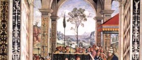 The scene is structured in such a way quite unusual. In fact, if the porch that lets you see the landscape belongs to the Umbrian tradition inaugurated by Perugino and the throne is also present in other scenes of the Library, the original is the part of a curtain that separates the group of cardinals from the large group of onlookers.