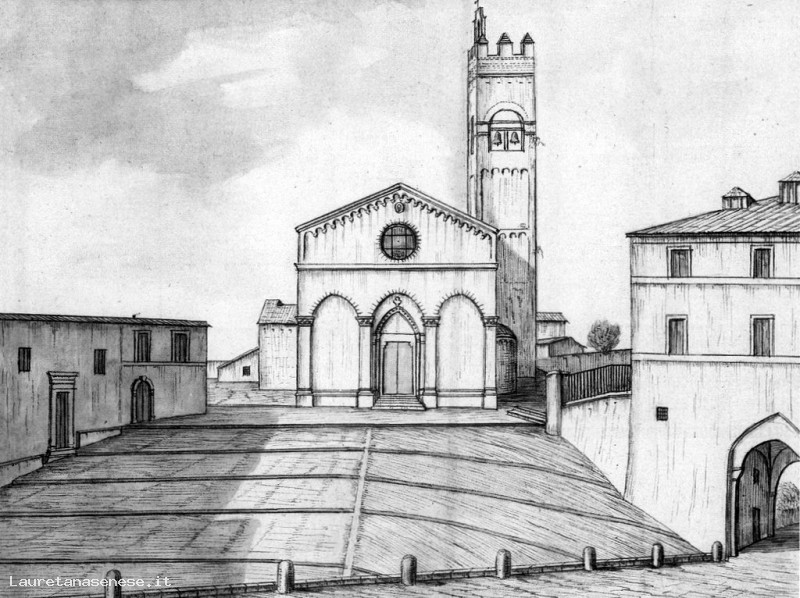 Altro schizzo di Ettore Romagnoli che testimonia la veridicità di alcune supposizioni che facevano risalire la realizzazione della grande scalinata antistante la Pieve Romanica di Sant'Agata alla seconda metà dell'ottocento, in contemporanea all'urbanizzazione di via Mameli e alle sue ramificazioni, da sempre conosciute come "vie Nove".