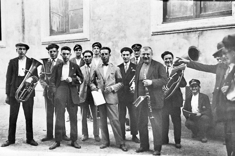 Componenti della locale Filarmonica all'uscita della prova settimanale, vengono ritratti subito fuori dalla sede della banda.