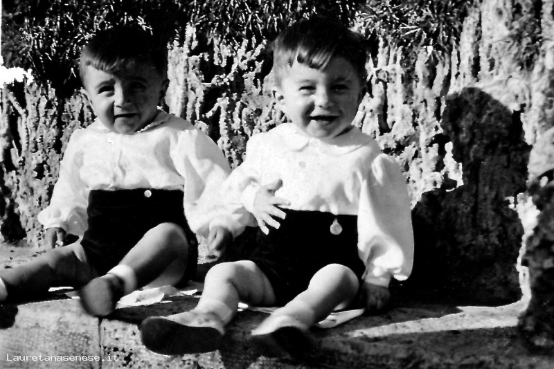 Due bambini paffutelli di poco più di un anno, fotografati su una panchina della Stazione di Chiusi Scalo, in attesa della partenza dei rispettivi babbi per andare sul fronte a combattere.