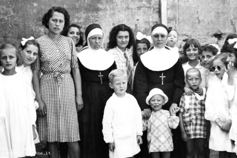 In questa foto avuta da Franco Guerrini, riconosciamo con certezza solo lui, che è il bambino con il cappello bianco tenuto per mano da una suora.