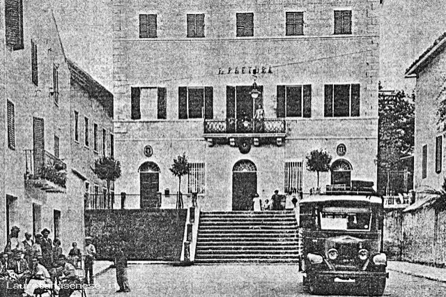 Gli anni ’30 ’40 e ’50 del secolo scorso, hanno rappresentato il periodo di transizione fra: il trasporto basato su animali da traino e quello basato sul motore a scoppio, alimentato dai derivati del petrolio. Questa foto ci sembra rappresentare bene questo periodo. Infatti, ritrae un goffo pullman che, negli anni ’30 e ’40, collegava Asciano con Siena.