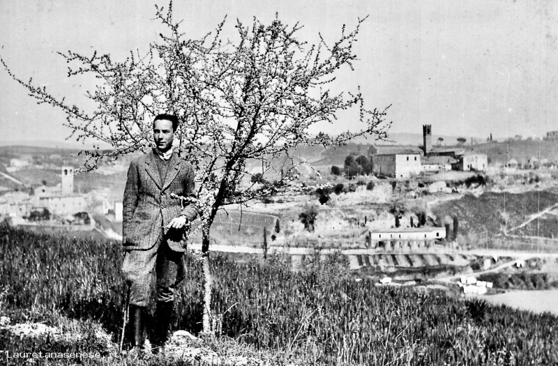 Azelio Laschi, un giorno di primavera sulle colline lungo la strada per Palazzo Venturi, si fa fotografare accanto ad un arbusto in fiore.