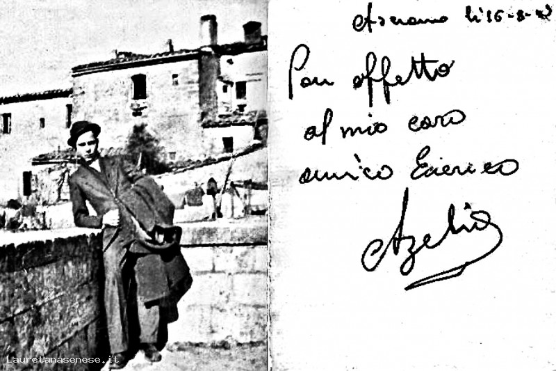 La foto ritrae il giovane Azelio ai giardini pubblici, qualche mese prima della sua uccisione. (La dedica sul retro, porta la data del 16 Agosto 1943)