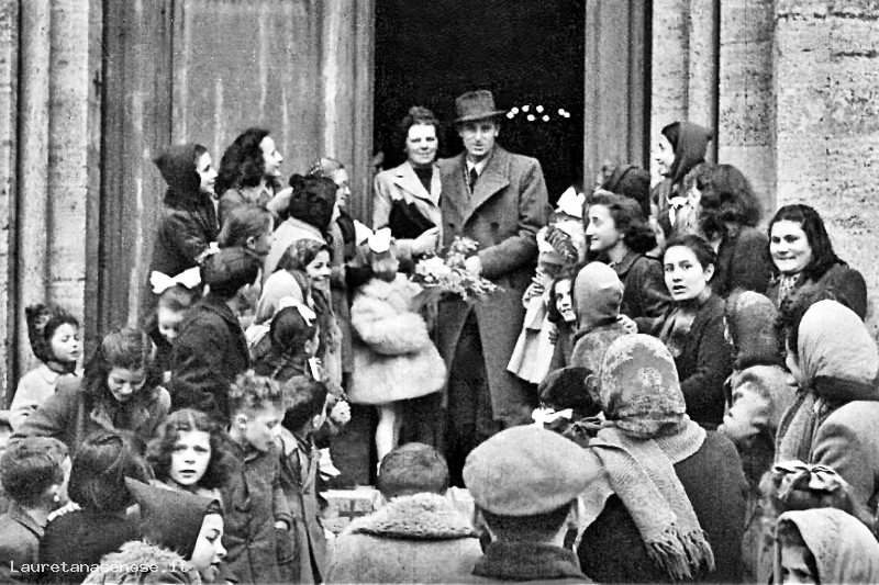 Nella foto vengono attorniati da conoscenti e tanti bambini curiosi che sperano di raccoglire qualche confetto.
