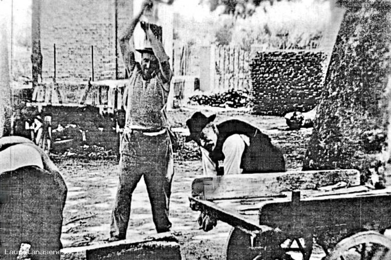 Liberato Marignani, aiutato dal padre e un collaboratore raddrizza a mazzate il segone usaro per tagliare i tronchi d'albero. La loro attività prevalente era quella di trasformare i tronchi d'albero in tavole grezze per le falegnamerie del paese.