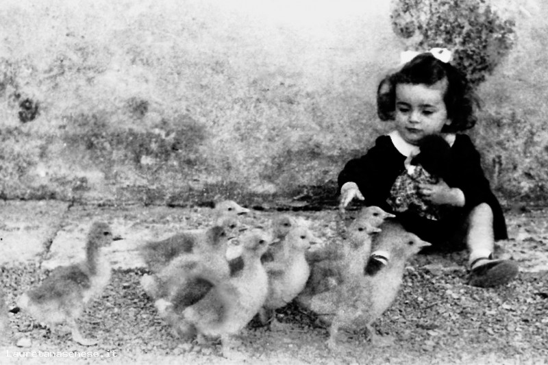 Si tratta della piccola Rosanna Burroni affascinata dal passaggio di alcuni pulcini di anatra, liberi di scorazzare nell'aia come usava una volta.