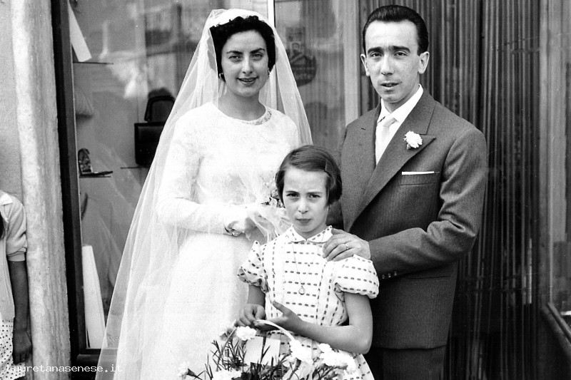 si lasciano ritrarre davanti al negozio di "Fringuello", zio dello sposo e datore di lavoro temporaneo della sposa.