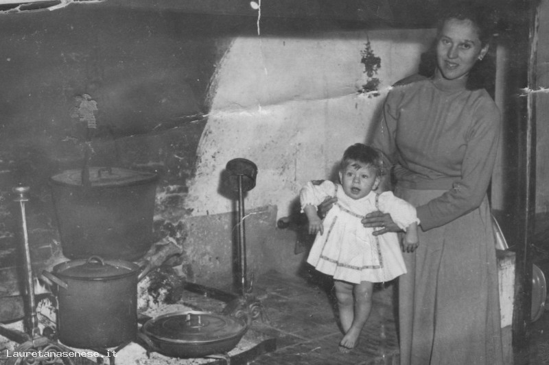 Gina Agnelli, la moglie di Sirio Cresti, accanto al camino del podere Le Carraie con la figlia Sonia.