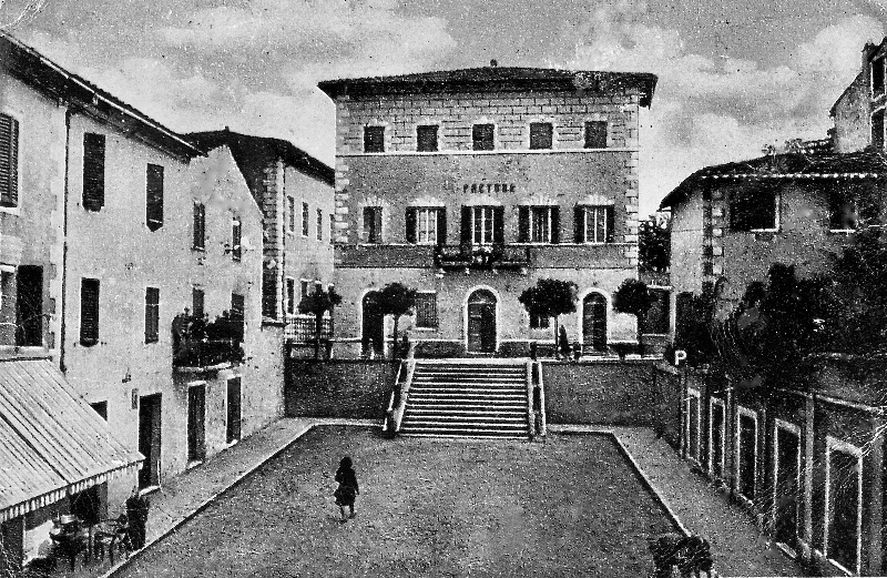 A dominare la piazza da cima alle scale l’edificio della Pretura che al suo interno aveva l’abitazione per il pretore e quella per il secondino addetto alle carceri. Inoltre al piano terra si trovava la sala delle udienze e all’ultimo piano le celle per i reclusi. Sul lato sinistro della piazza c’era la bottega del Paci Gaetano che faceva il lattoniere e che la figlia, Maria Luisa, trasformò in negozio di vendita Gas ed Elettrodomestici.
