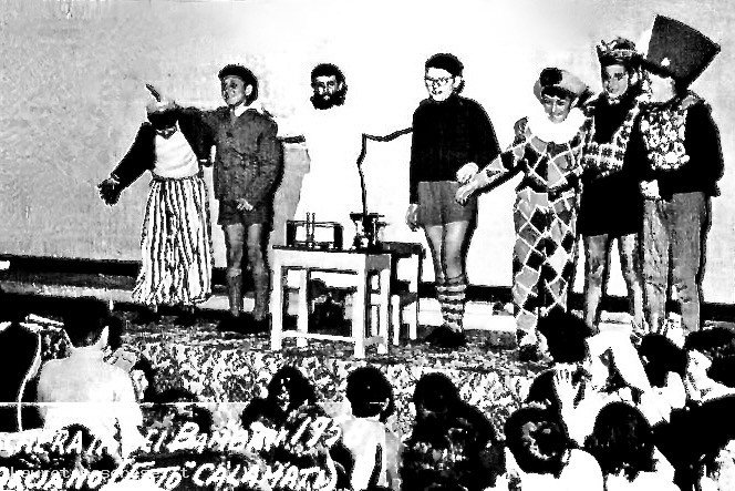 Recita di una piccola commedia sul palco del Cinema Parrocchiale con alcuni bambini in costume.