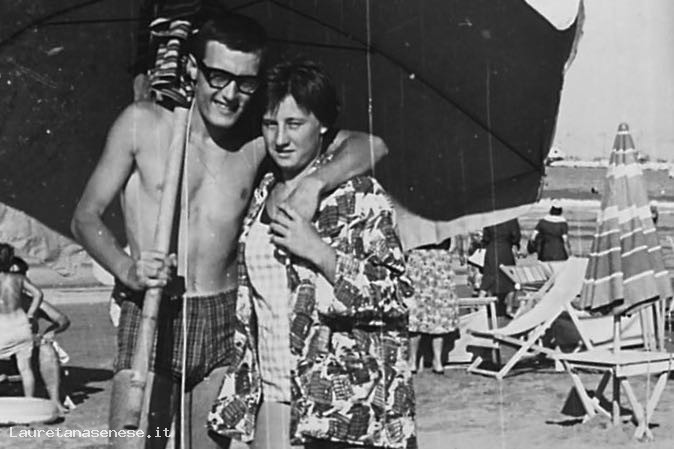Giancarlo Cantini abbracciato con un'amica sotto l'ombrellone.