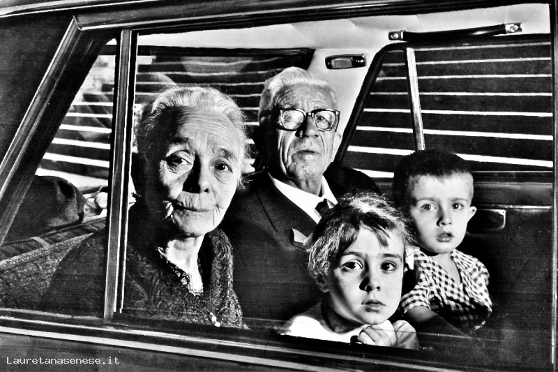 Nella foto in auto al ritorno dalla chiesa con in braccio i nipoti Cristina e Gianfranco, figli di Enrico il loro secondogenito.