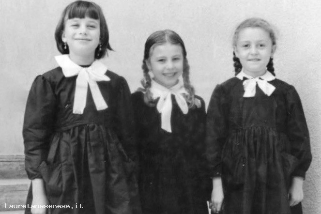 Ritratto di tre compagne di classe sulle scale di accesso alle nuove Scuole Elementari di via San Francesco, 1.