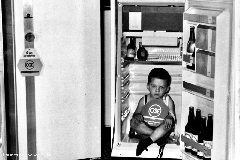 Il piccolo Stefano Gallorini, in visita dal nonno Giulio, che lavorava nel negozio di Marino Romi, è simpaticamente utilizzato per promuovere i nuovi e moderni Frigoriferi CGE