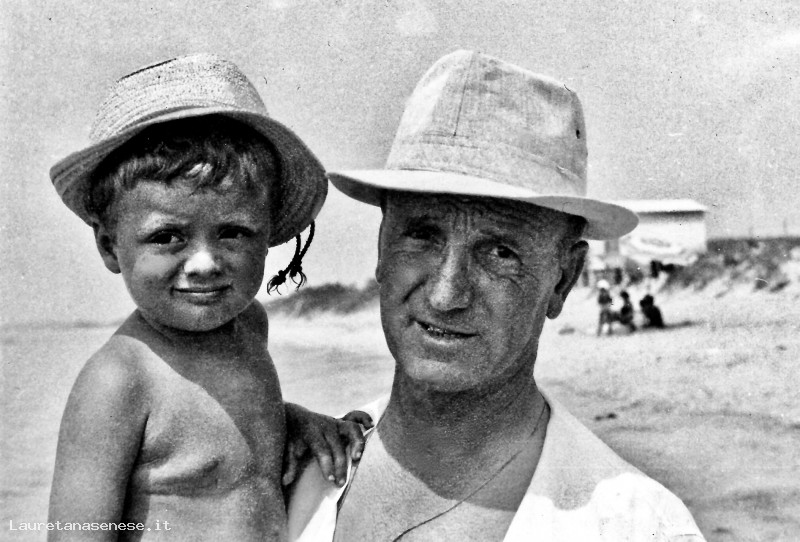 Il fattore della Pievina, Palmiero Moscadelli, al mare con in braccio uno dei suoi due piccoli gemelli: Sandro.