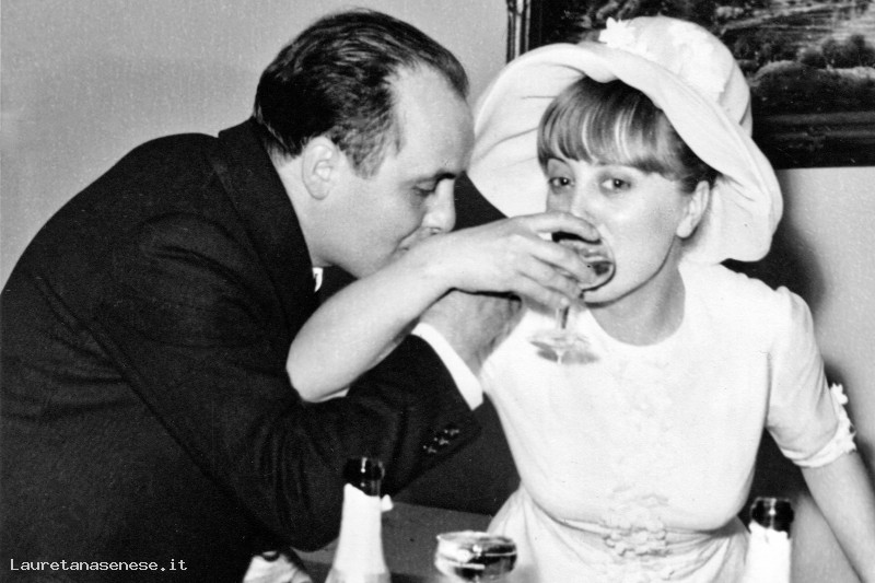 Marcello Giannettoni e Anna Moscatelli provano a brindare al termine del pranzo matrimoniale, con il rischio di versare lo spumante.