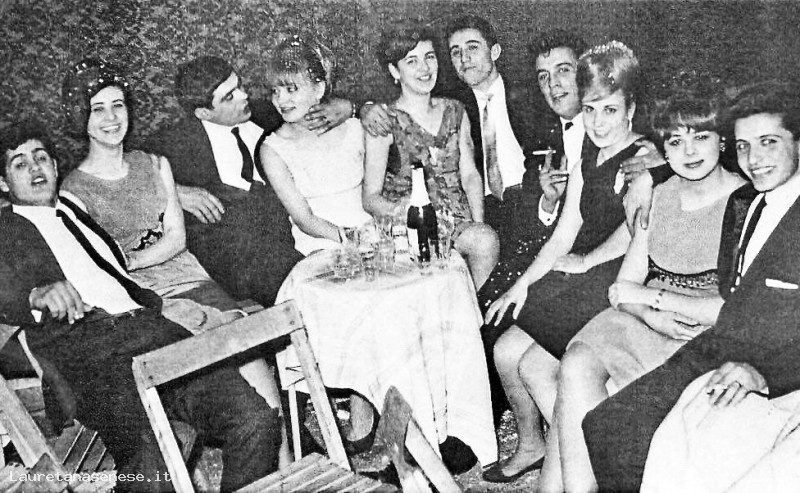 Questa bella foto ritrae un gruppo di amici intorno ad un tavolo con sopra una bottiglia di spumante, durante i balli di carnevale o di fine anno, che si svolgevano al Teatro Ravvivati.
