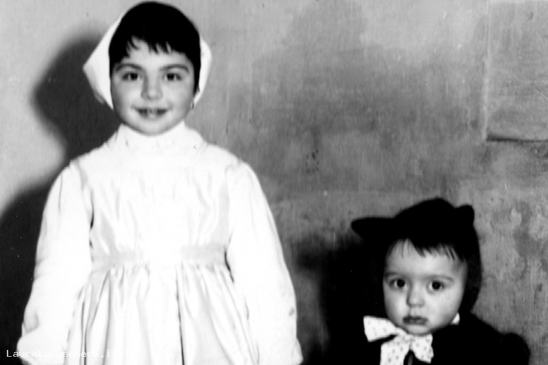 La piccola Alessandra Fratagnoli con un costume da olandesina, tiene per mano il fratello vestito da gattino nero.