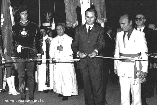 Oltre al Sindaco Calderini, elegantemente vestito in completo bianco, si riconoscono: l’Abate Generale degli Olivetani, il Dott. Giulietti presidente della ProLoco ascianese, l’immancabile Canapini subito dietro.