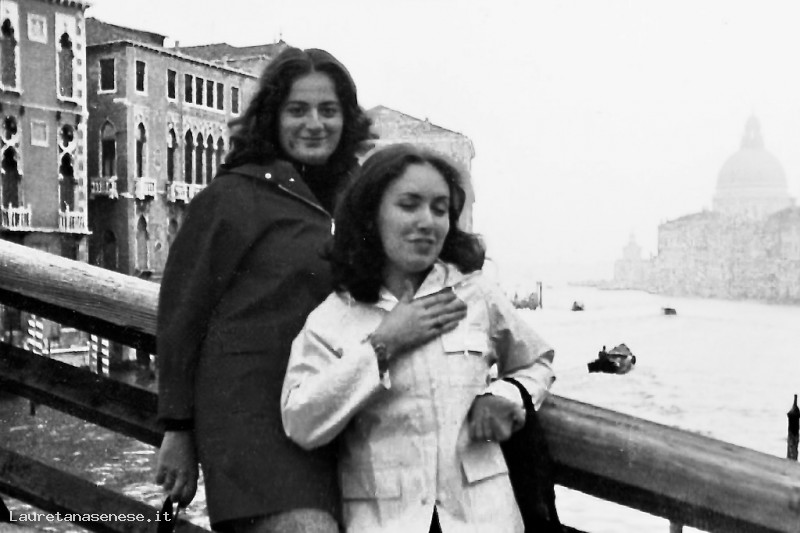 Due ragazze di Asciano, appena diplomate maestre, si fanno fotografare sul onte dell'Accademia, unico tutto in legno.