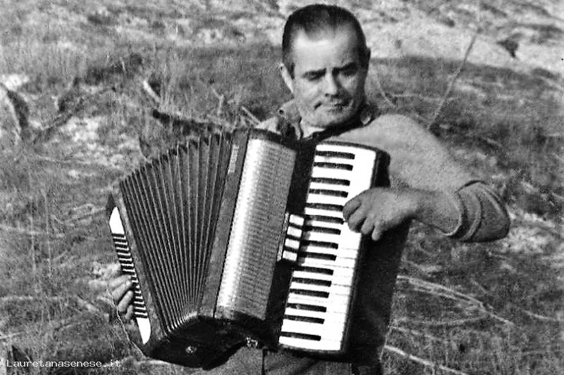 Primo piano di Luigi Landi, detto il Golo, con la sua amata fisarmonica. Luigi era una persona eclettica che, nonostante un incidente che in gioventù lo rese parzialmente invalido, non si è mai limitato a fare l'amato custode della scuola elementare, ma si è sempre prestato a suonare nelle occasioni di feste in campagna.