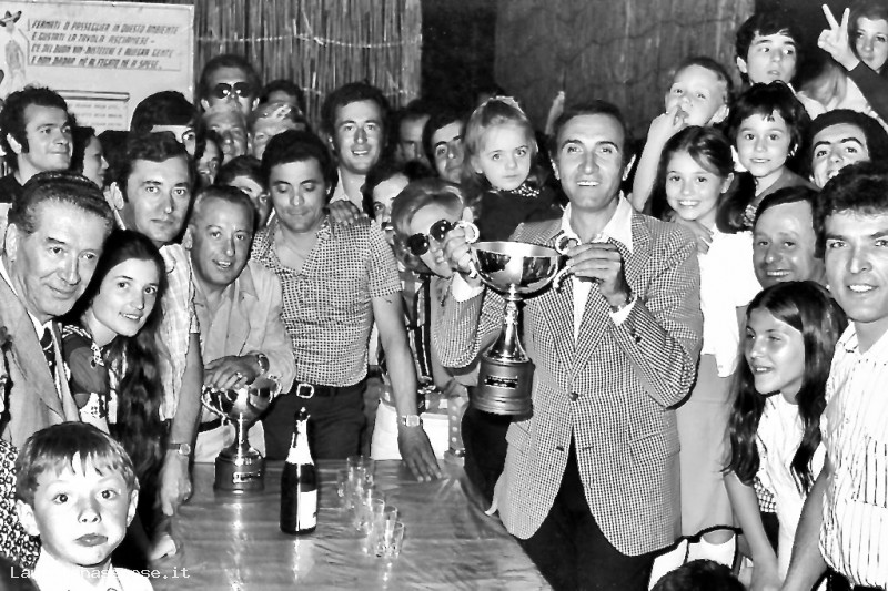 Pippo Baudo premiato per la sua partecipazione alla Mostra Mercato Ascianese, mostra con piacere la coppa ricevuta, circondato da una folla di personaggi locali: