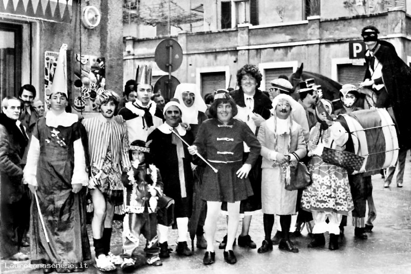 Foto ricordo davanti al Bar Heevè, di un gruppo di maschere interpretate da buontemponi locali e di alcuni spettatori occasionali.