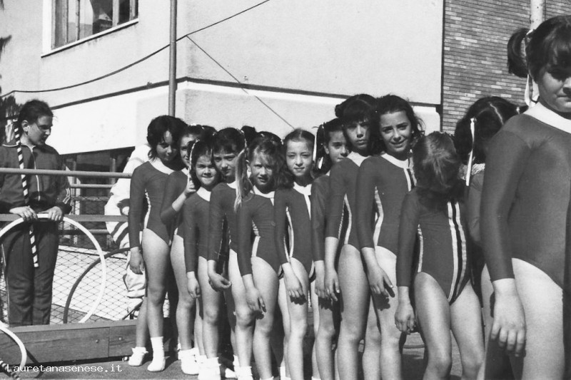 Ragazzine di terza elementare che si esercitano all'aperto nel campino adiacente alla scuola. Dl costume che indossano, sembra che si striano preparando per un saggio di ginnastica artistica.