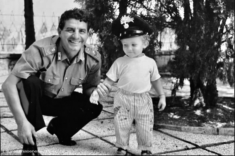 Bellissima foto che immortala un piccolo aspirante Carabiniere con un milite dell'Arma.