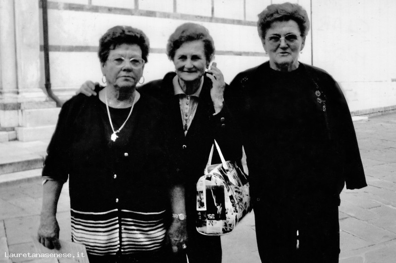 Tre care amiche in gita, probabilmente a Pisa, posano per una foto ricordo: