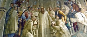 In this scene there are many important figures: St. Benedict the center, beside him the figure of the King of France, whose face is a portrait of the same Riccio. Then there is Leonardo da Vinci and Raphael, with his hat on the right. Blessed is the one behind San Luca Signorelli while the one in front is Lorenzo the Magnificent. In the background a view of Rome: a bow and riders who break giving strength to the main scene. The protagonists are two young Romans of the scene, and Mauro Placido, who follow St. Benedict becoming monks.