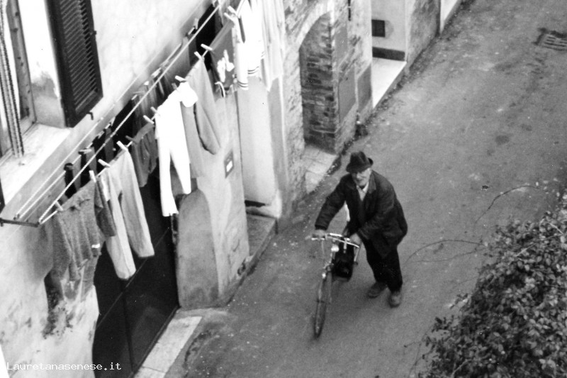 Ilveno Moscadelli, al rientro in bicicletta dalla vigna, mentre percorre via Santa Maria.