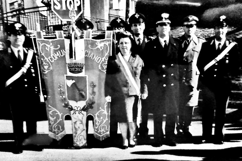 In occasione dell'intitolazione del locale Istituto Scolastico Comprensivo a Sandro Pertini: Franca Mariotti, si lascia ritrarre insieme a tutti i rappresentanti istituzionai delle forze dell'ordine a livello locale: