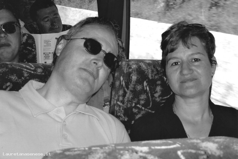 Claudia Montigiani con il marito, durante un trasferimento in pullman.