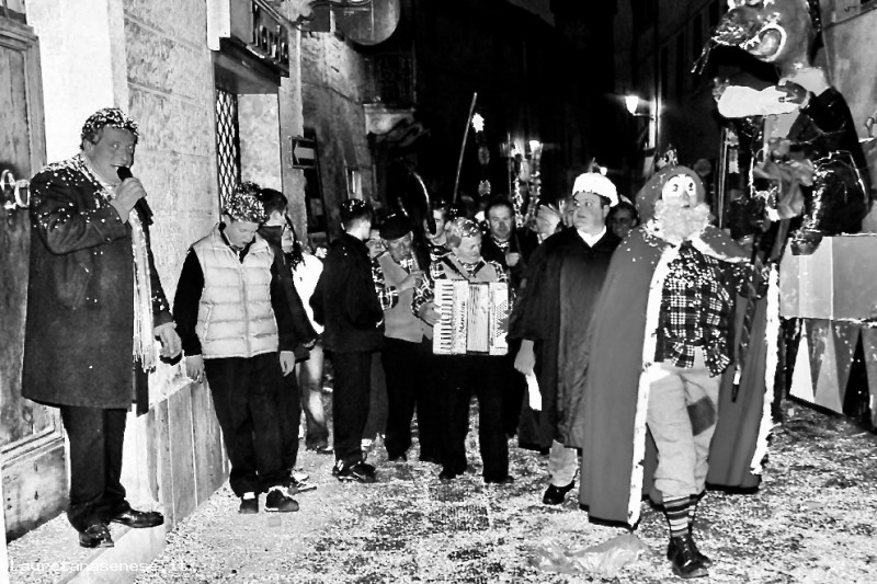 In piedi sull'ingresso dell'edificio che una volta ospitava l'Albergo del Sole, Franco Maraghini, conosciuto da tutti come Il Palle, accompagna e descrive il corteo di maschere e mascherine che trasferiscono Meio dalla sua residenza fino a Piazza Garibaldi, dove il famoso ciabattino ascianese verrà bruciato per simboleggiare la fine del Carnevale.