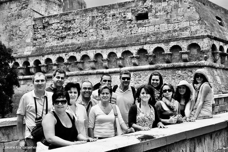 Gruppo di amici in crociera mentre visitano il castello Svevo di Bari.