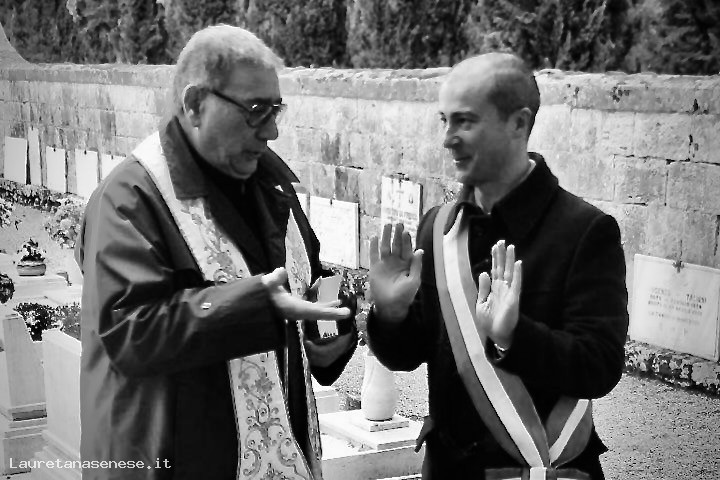 A margine della cerimonia di ricollocazione dei resti del garibaldino Carlo Baronti. Parroco e Sindaco scambiano due prole: