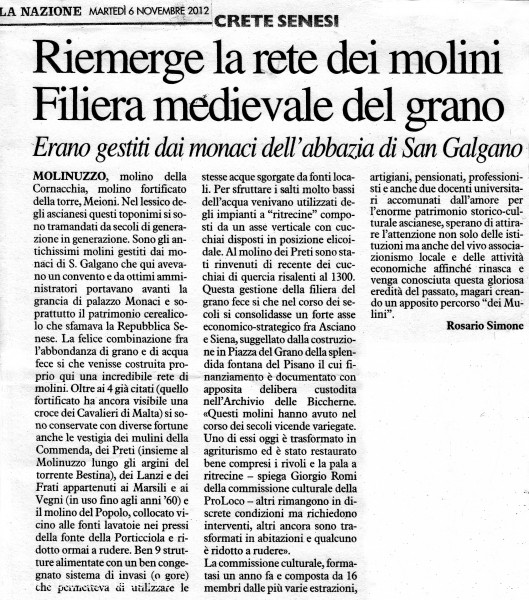 2012, 6 Novembre - Riemergono i resti della rete dei mulini ad acqua Asciano