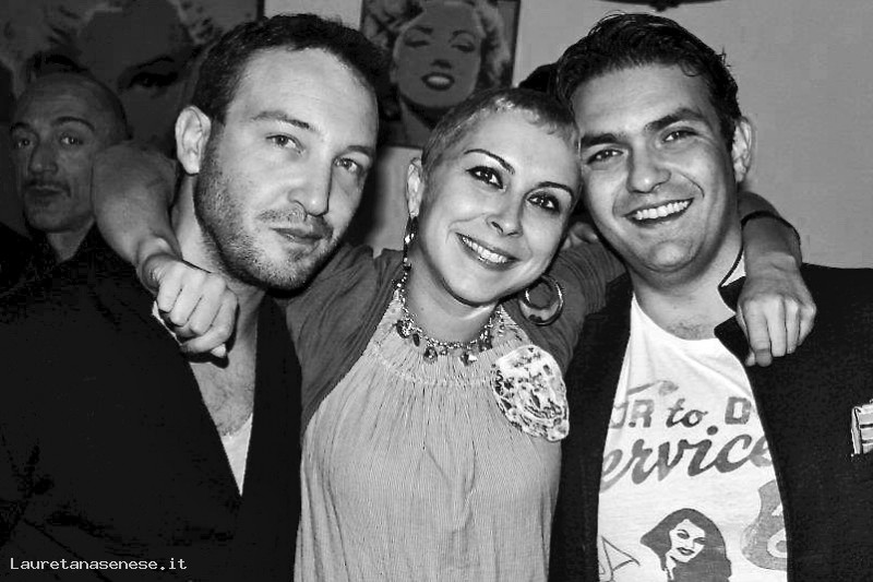 Cristina Francini Naldi abbraccia con piacere due bei giovani locali, durante una delle tante feste alla RUMBA Cafè.
