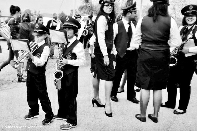 Prima di sfilare all'interno del paese di Chiusure, durante lo svolgimento della Festa del Carciofo, i giovanissimi componenti della Banda si esercitano sotto gli occhi vigili dei più grandi, che stanno in disparte a chiaccherare.