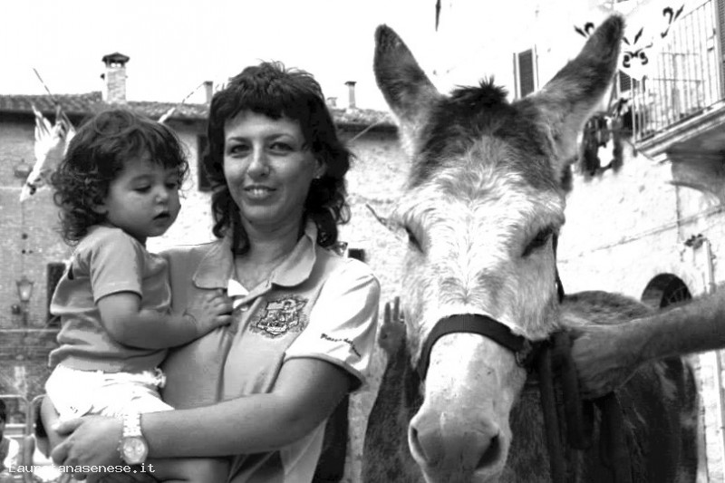 In questa foto, il ciuco assegnato alla Contrada del Piazza, ritratto con accanto due contradaiole, una delle quali non sappiamo quanto consapevole.