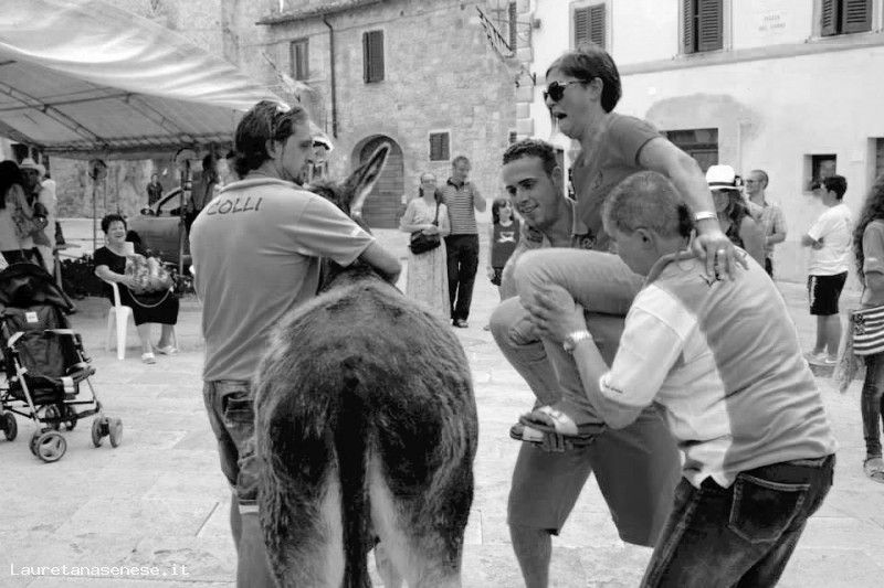 Immagine molto originale del tentativo di far provare a Lucia Angelini il ciuco assegnato alla contrada di Piazza del Grano.