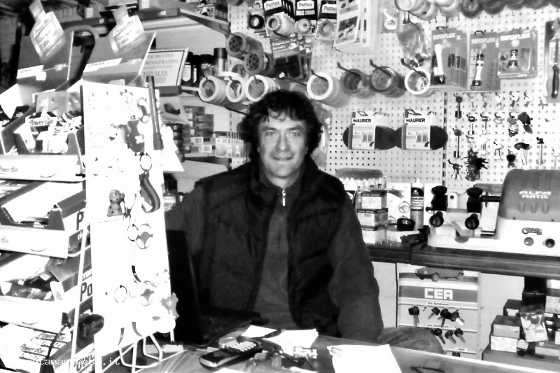 Foto di Alessandro Mucciarini, sorpreso dietro il banco del suo negozio di ferramenta, bici e accessori per ciclisti.