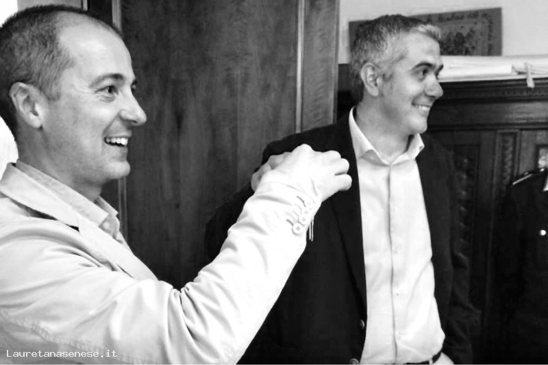 A conclusione delle elezioni amministrative, il sindaco uscente Roberto Pianigiani, consegna pubblicanente le chiavi del Comune e dell'ufficio al nuovo sindaco Paolo Bonari.