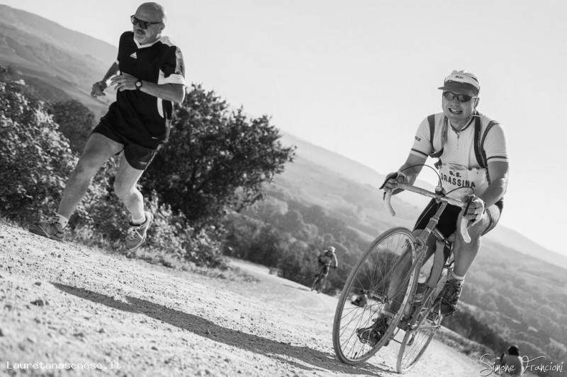 Il ciclista ritratto non sappiamo chi sia, ma il podista lo conosciamo bene: è Massimo Rossi, Rapolanese trapiantato ad Asciano, con brillanti trascorsi agonistici nel mondo del podismo.