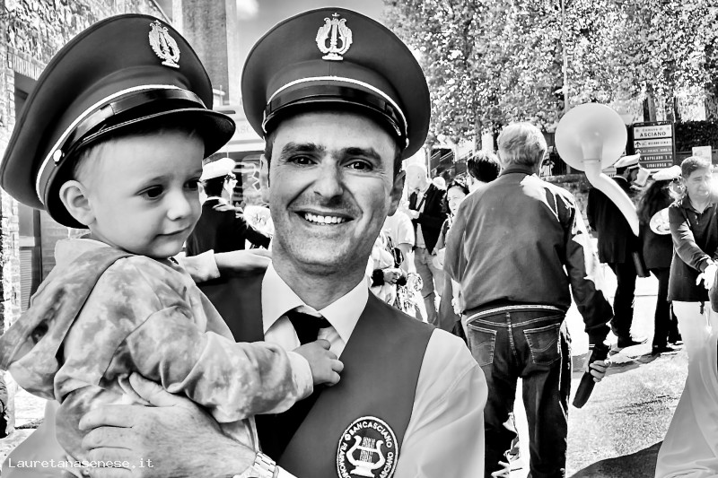 Appena terminata l'esibizione mattutina del Festival Bandistico, il babbo: Tiziano Moscatelli corre ad abbracciare il fiiglioletto Leonardo e gli porta il cappello da musicista, forse come auspicio per la sua futura partecipazione alla Banda Cittadina.