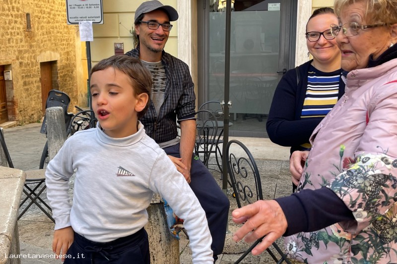 La nuova famiglia costituita dal figlio minore di Silvio, la moglie farmacista e il figlio di 5 anni, conversano con Anna Leonini della Coop, moglie del defunto Giovanni Regoli.