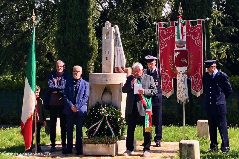 In questo luogo, dopo la posa di una corona di alloro, alla tradizionale benedizione da parte del parroco don Luca, si sono susseguiti brevi interventi da parte di personaggi legati in qualche modo al mondo Partigiano che sopravvive ancora oggi, basato come è su solidi principi che guidano l'esistenza umana.